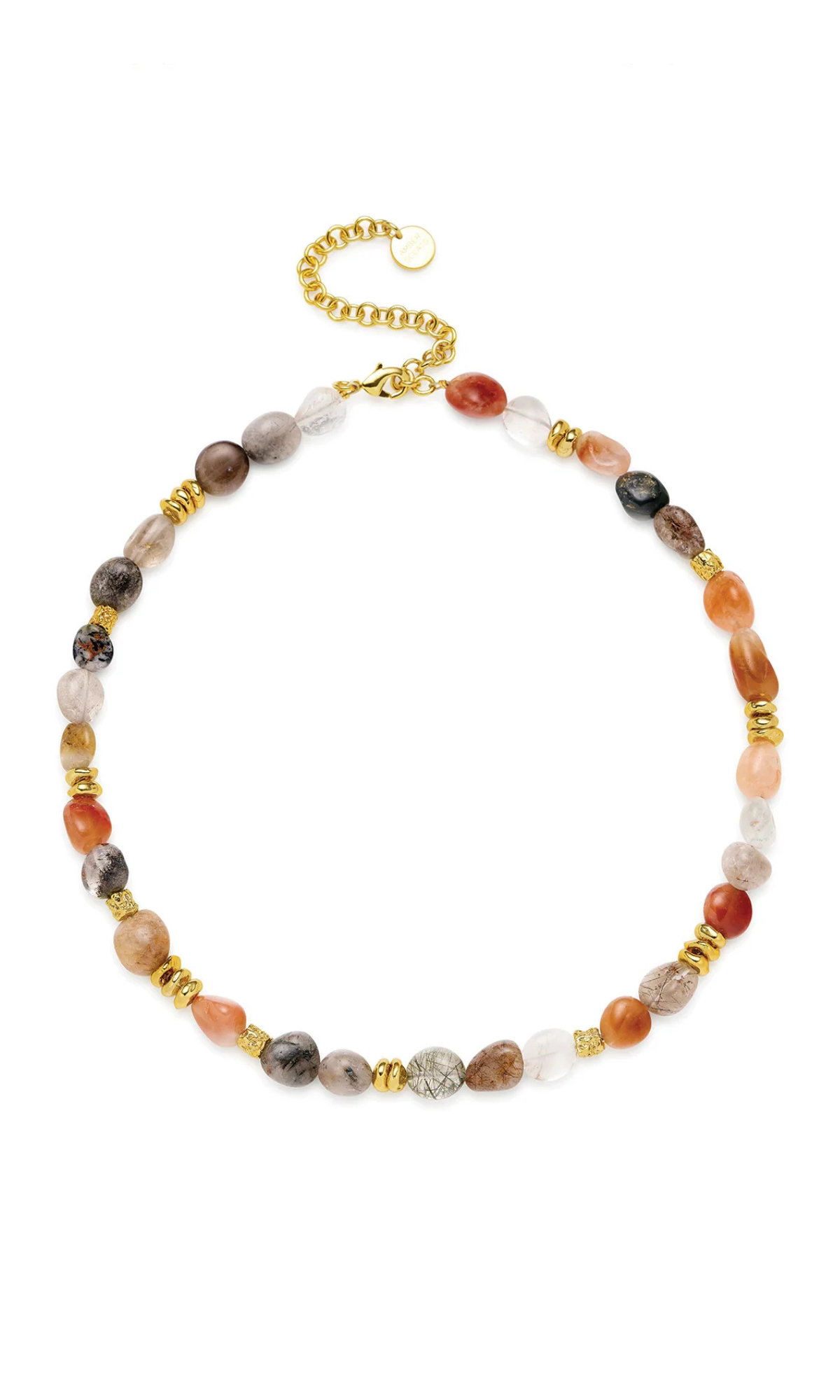 The Atrani Necklace boasts mixed Ritulated Quartz, a visually striking and energetically potent gemstone. Wear yours with the matching Atrani Bracelet. Genuine semi-precious materials, please allow for natural variances in stones. Each piece is one of a kind.