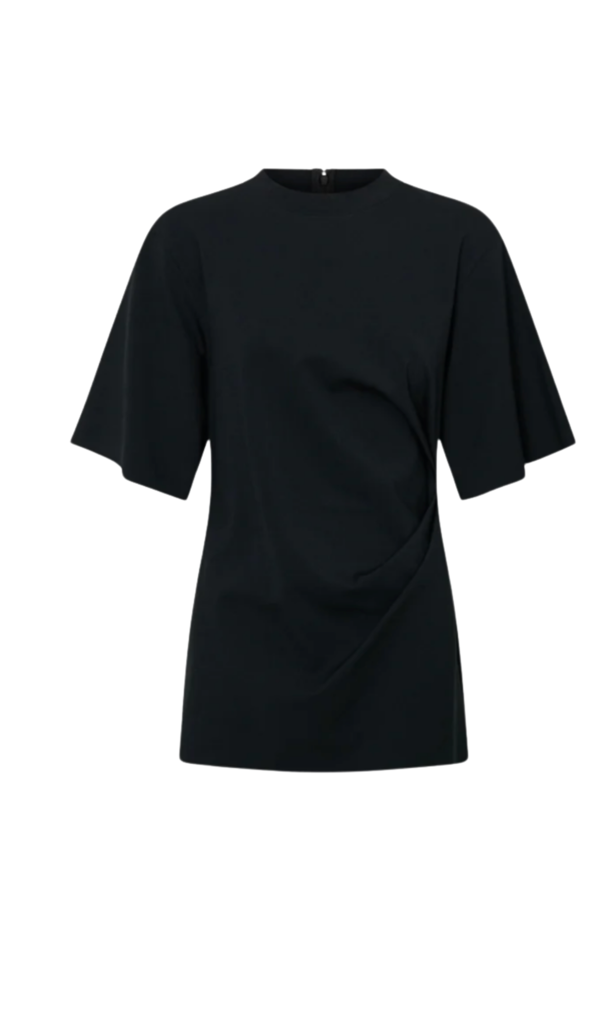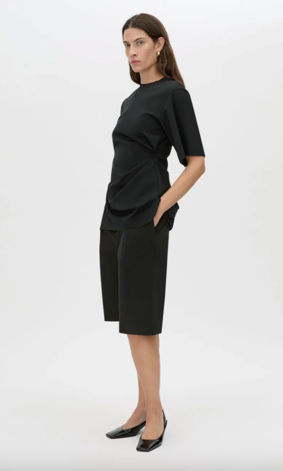CAMILLA AND MARC Felix black crew neck asymmetric draped top with side split. Deep waist tucks, dropped armholes, ribbed neckline, relaxed fit.
