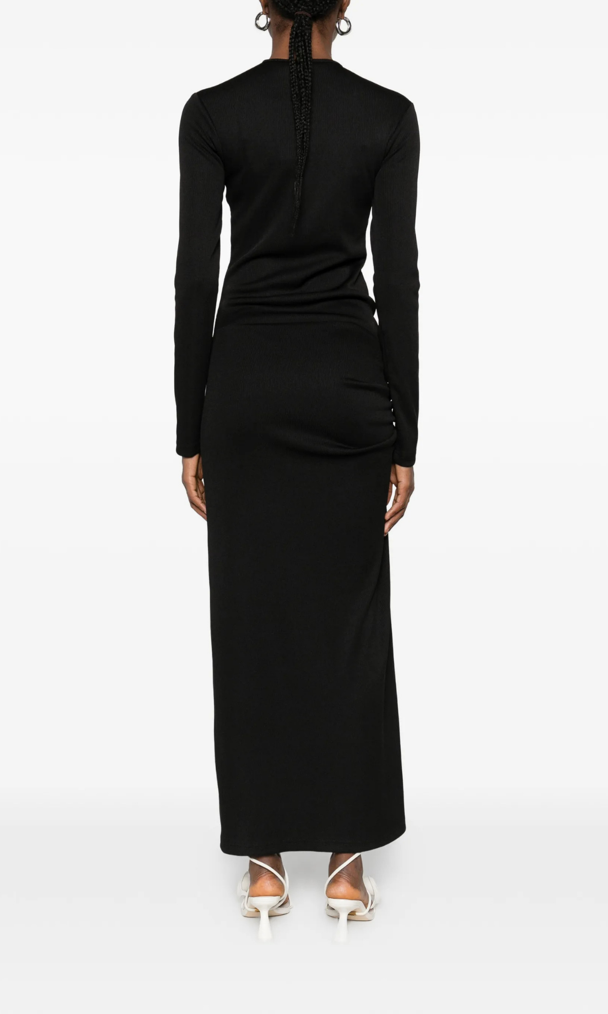 The Crystal Pendant Open Twist Long Sleeve Dress is defined by a series of elliptical cut-outs that punctuate the centre-front, anchored by a polished crystal pendant that draws the eye to the ruched bust. Cut in a fine rib jersey, the silhouette follows the body with a clean sleeve and subtle flare through the hem.