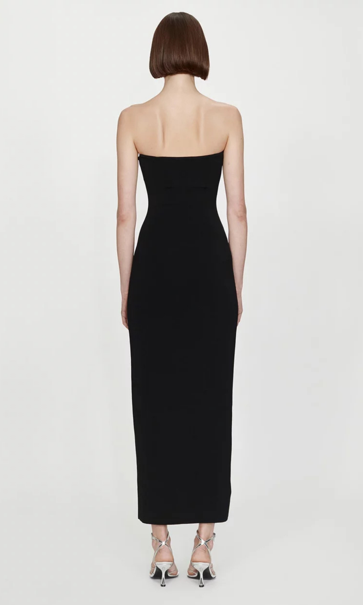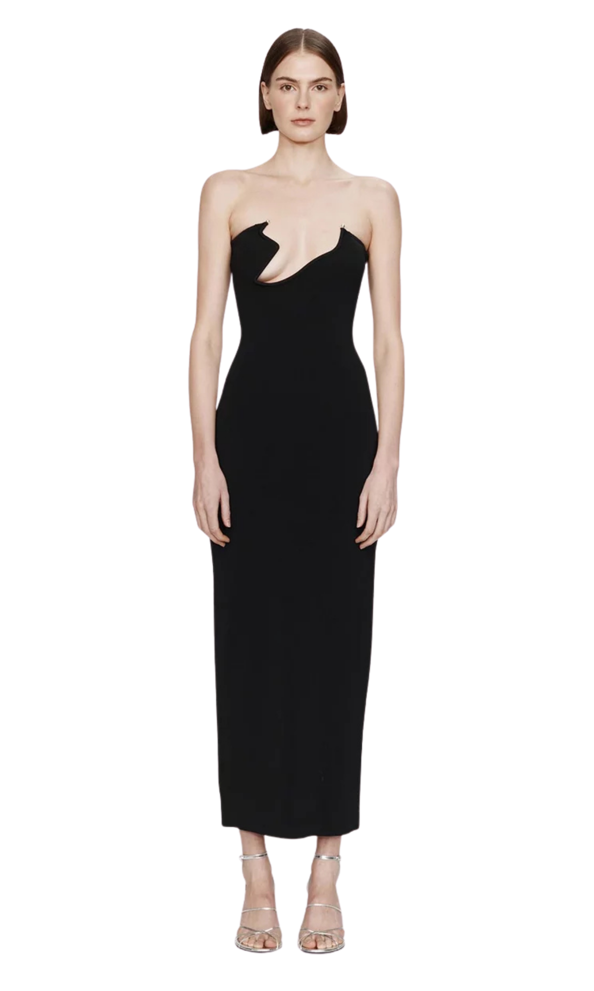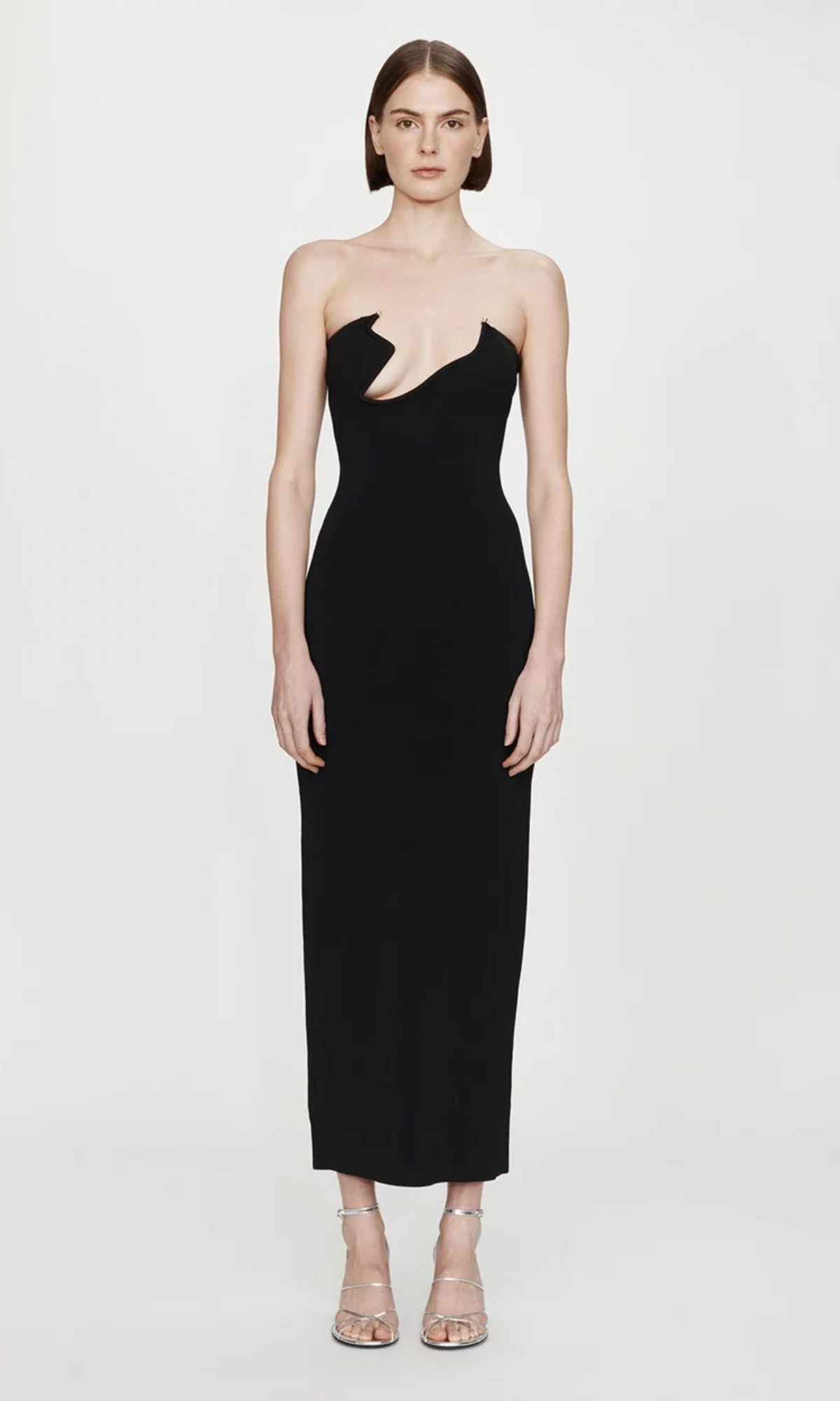 The Odessa Arced Column Knit Dress combines arc-like paneling and a column silhouette in knit fabric for elongated, body-skimming elegance.