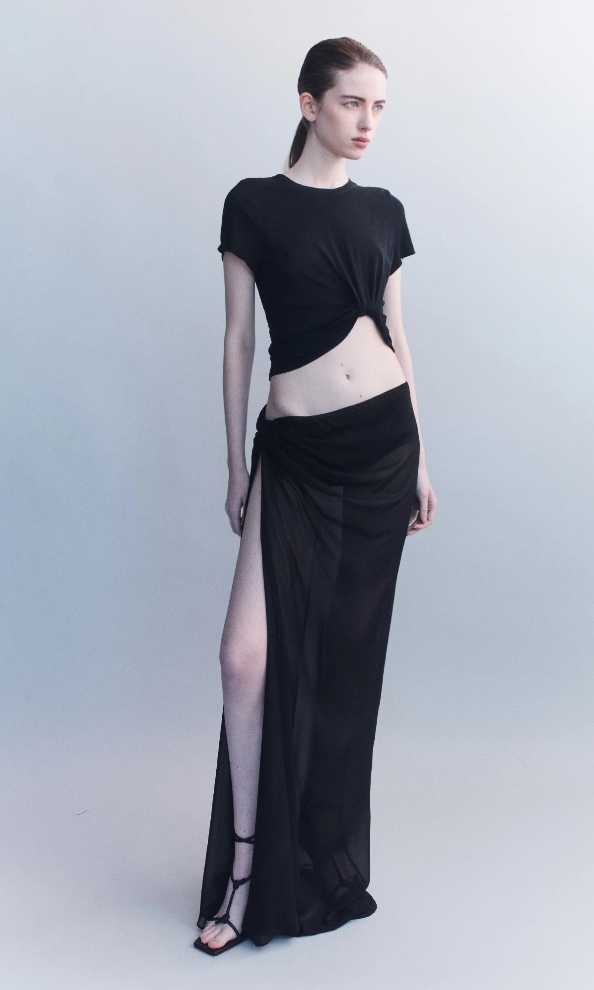 Sheer silk georgette is cut into a sarong-inspired silhouette, knotted at the hip to create diagonal drape and a decisive side split. It sits low on the waist and falls to a floor-grazing hem, balancing sensuality with precision.