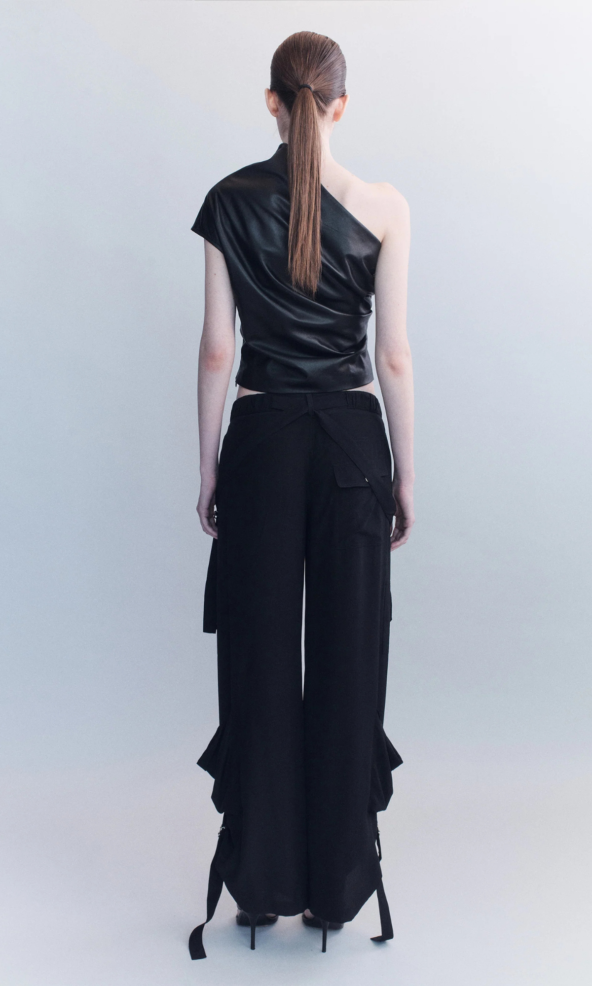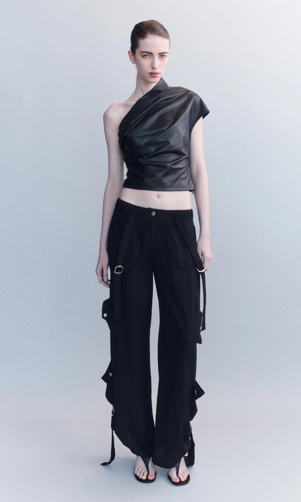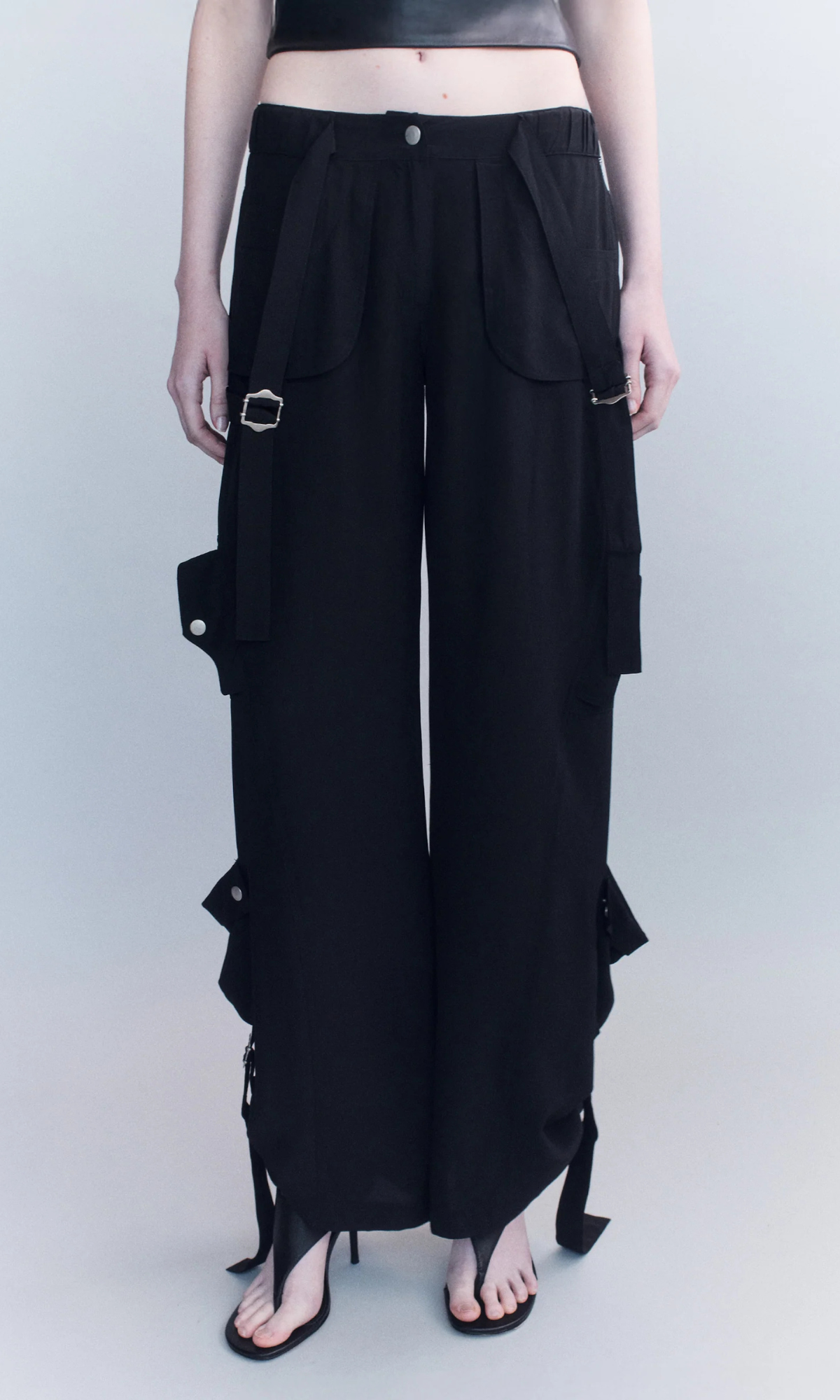 The Larson Pants reinterpret cargo codes in fluid silk crepe, balancing utilitarian detail with a draped, elongated line. Featuring oversized flap pockets, adjustable straps, and hardware trims, the wide leg falls with controlled ease while retaining a directional, urban edge.