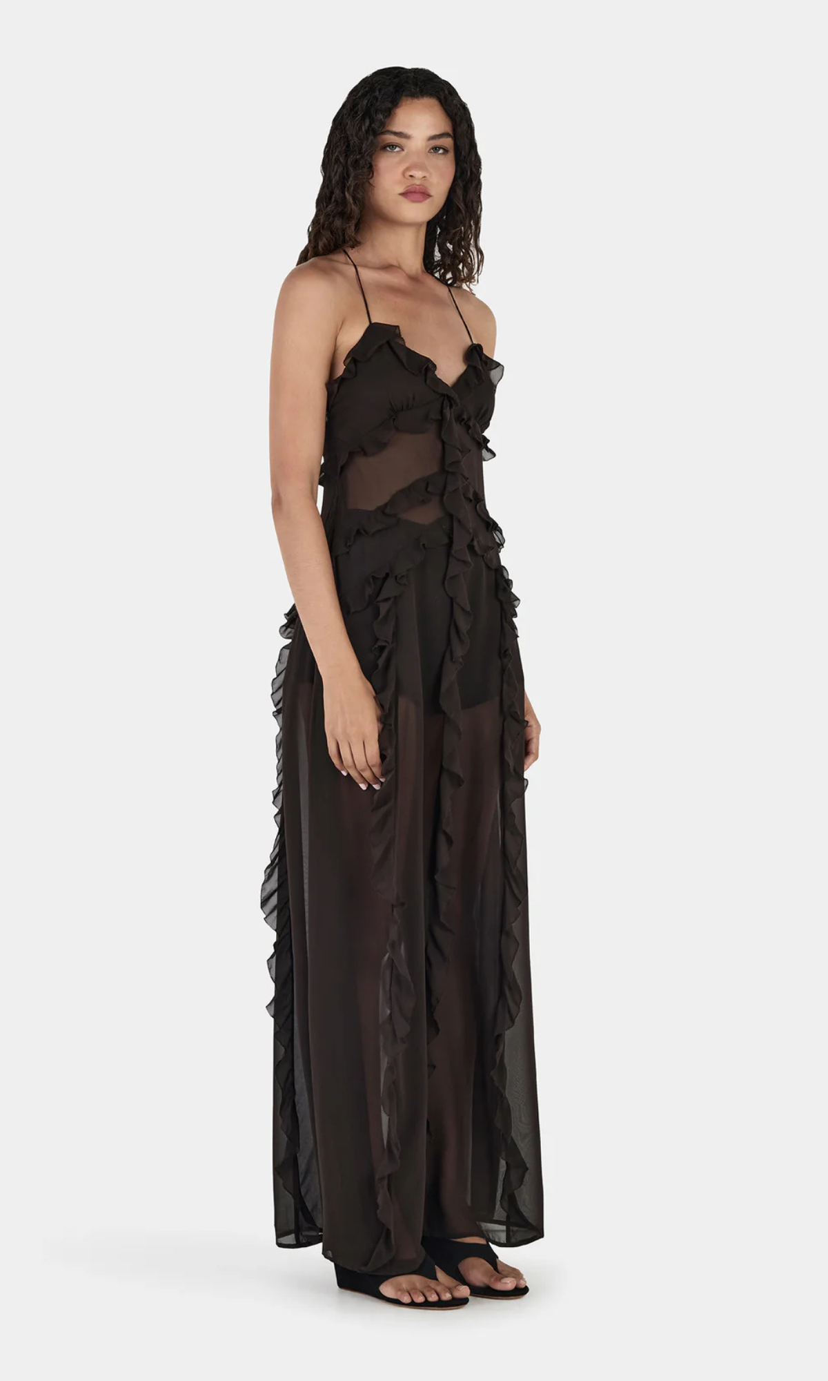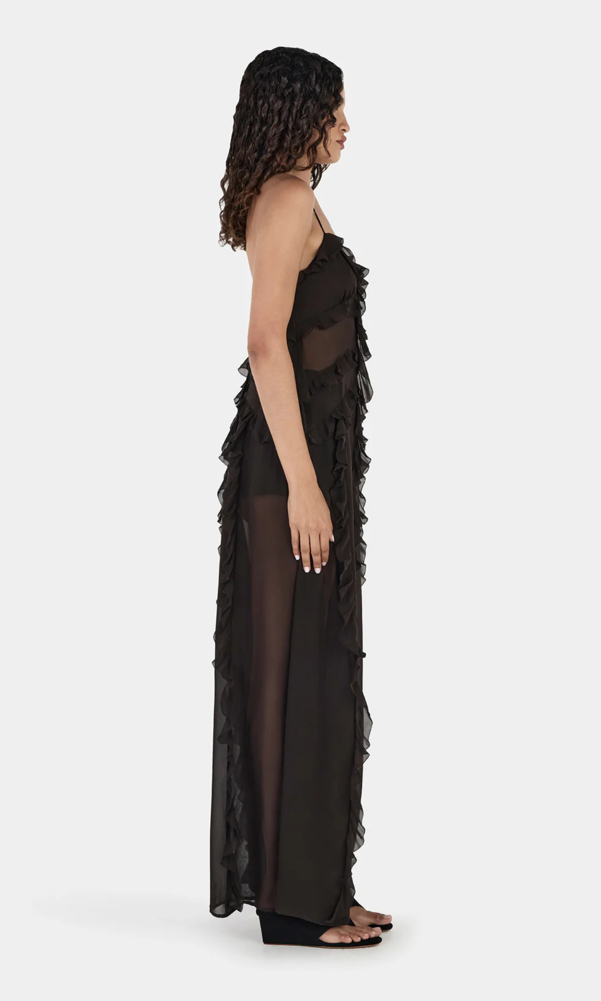 The Laila Maxi Dres is sheer maxi length dress cut from a delicate silk georgette fabrication. Designed with a soft, cascading ruffle detail through the front and bust cups, the open back features delicate rouleau criss-cross ties for an adjustable fit, while an invisible zip closure offers a clean finish. This piece is styled with matching satin shorties. Dress up with your favourite heels, the Laila Dress is a special piece for your next event.