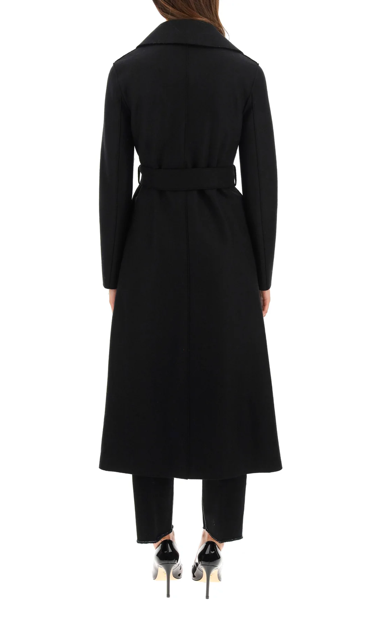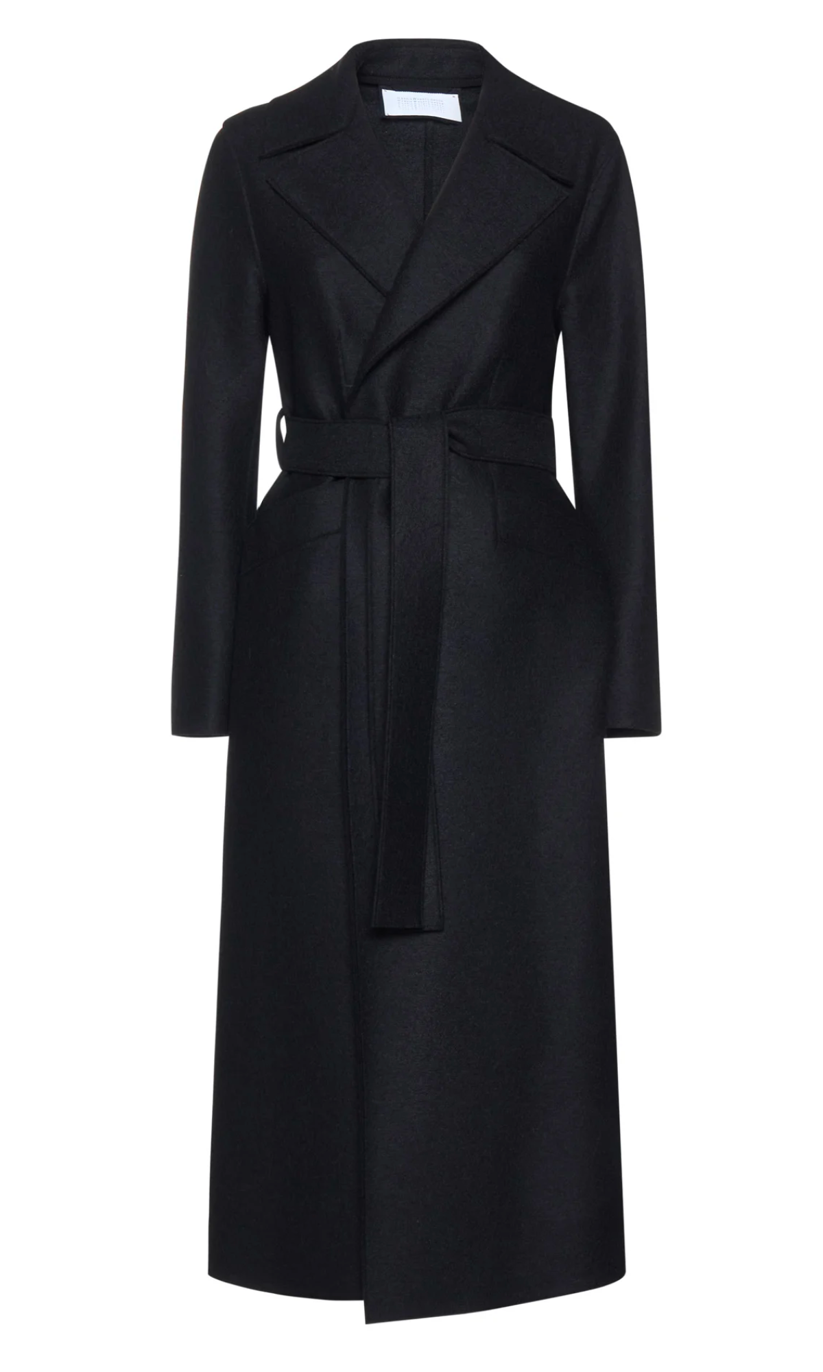 HARRIS WHARF LONDON'S Long Maxi Coat is a long coat with a straight shape and long fitted sleeve featuring welt pockets, belt loops, detachable self tie belt.