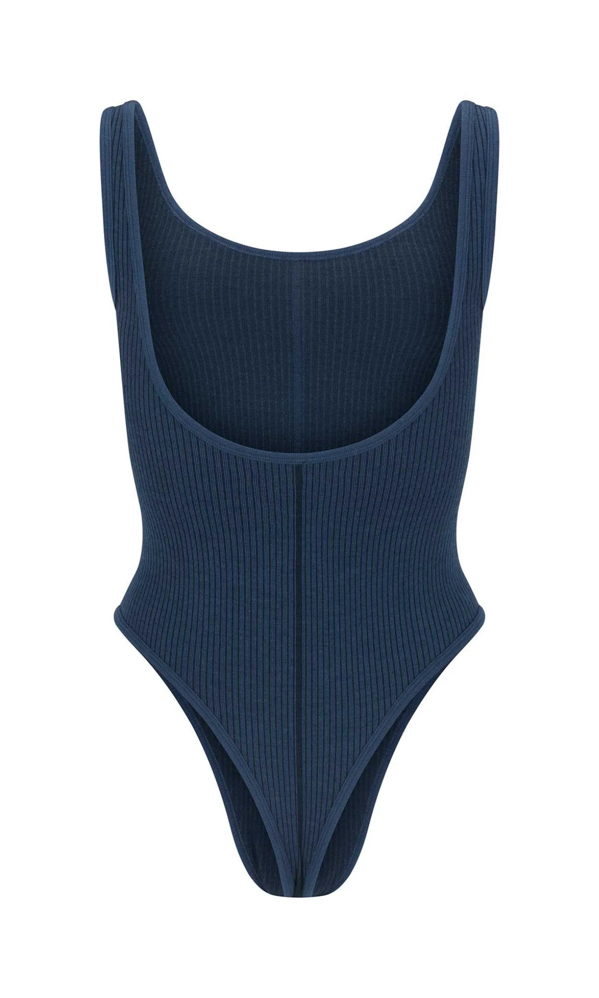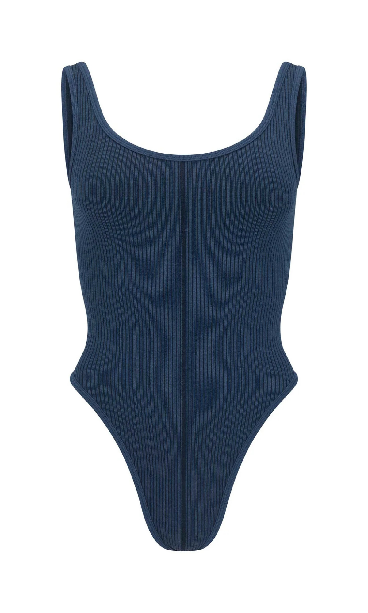Superfine Merino wool seamless rib bodysuit in signature Nagnata rib with a vertical stripe design detail at centre front. This style features a low scoop back, thong-style bottom, and high cut leg. The signature fabrication has a super-soft second-skin feel against the body and offers mid compression for support. Now available in sizes XS, S, M and L.