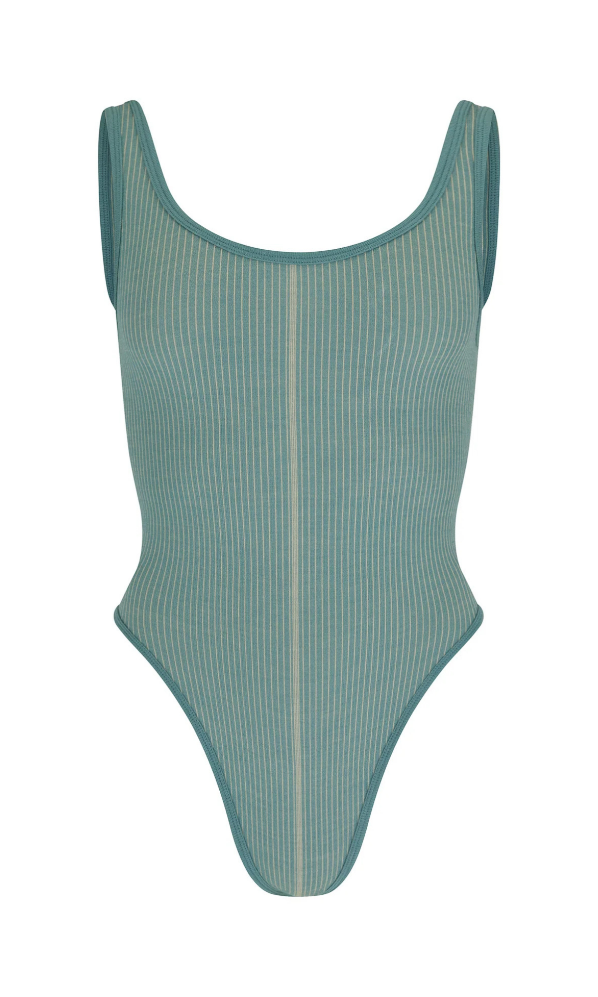 Superfine Merino wool seamless rib bodysuit in signature Nagnata rib with a vertical stripe design detail at centre front. This style features a low scoop back, thong-style bottom, and high cut leg. The signature fabrication has a super-soft second-skin feel against the body and offers mid compression for support. Now available in sizes XS, S, M and L.