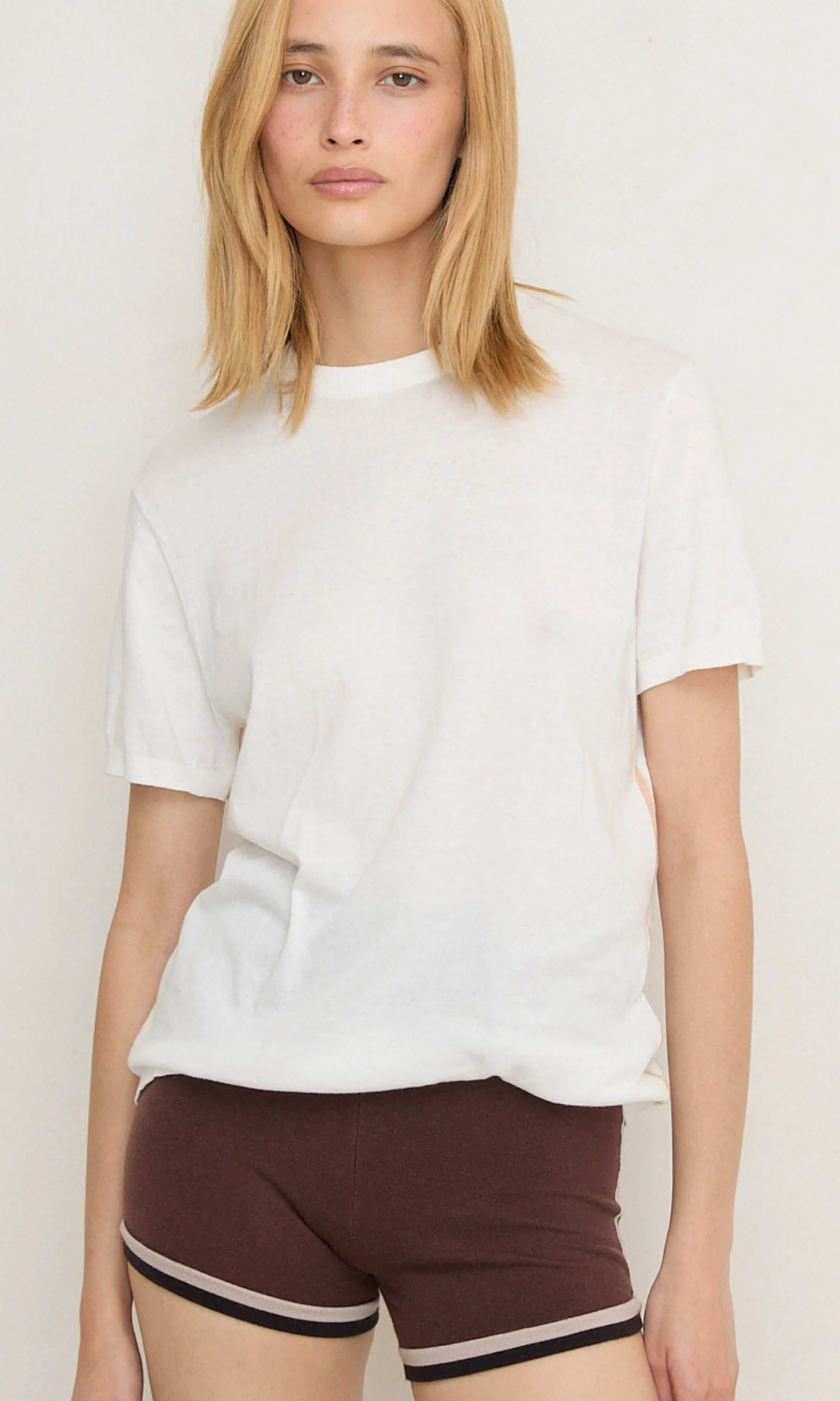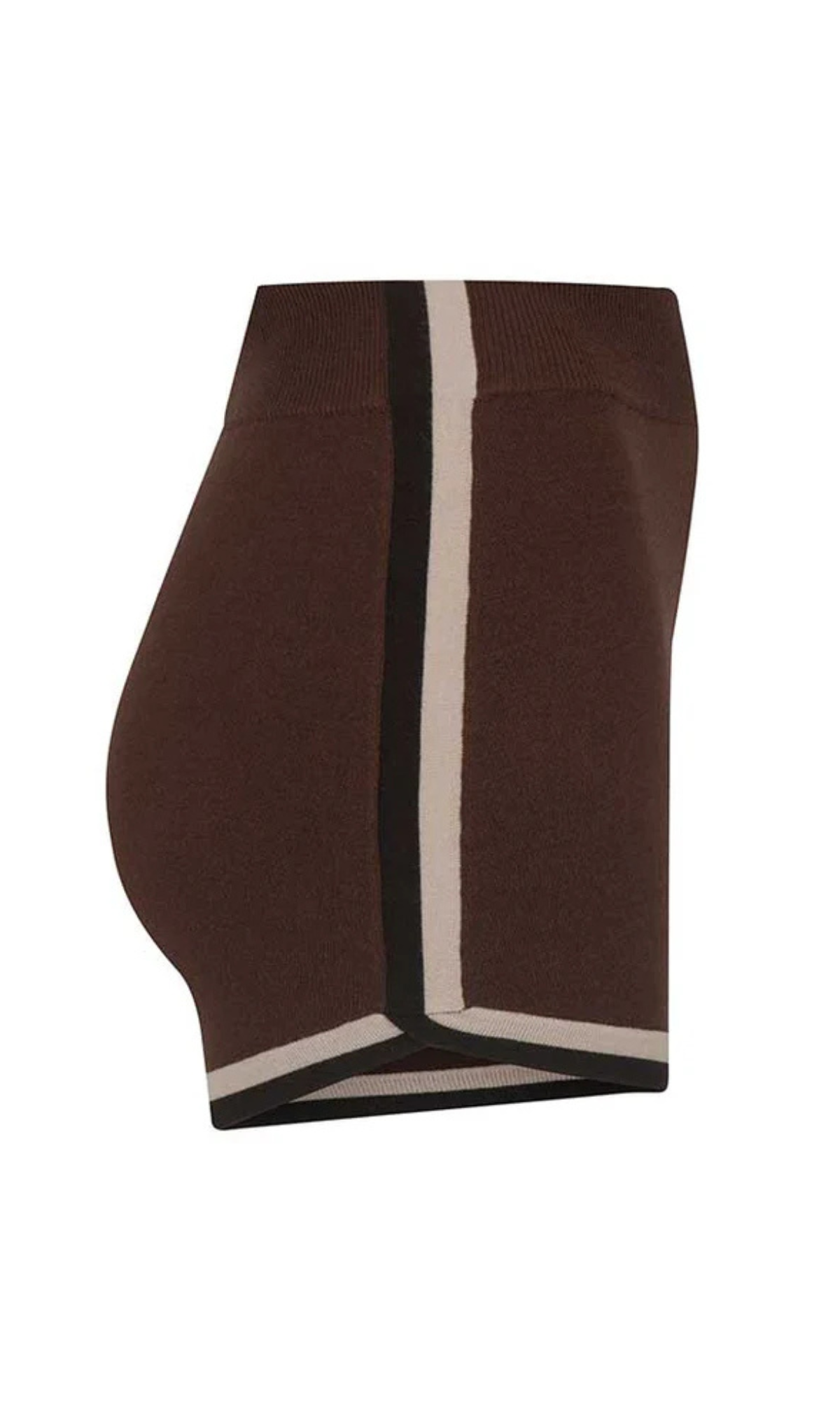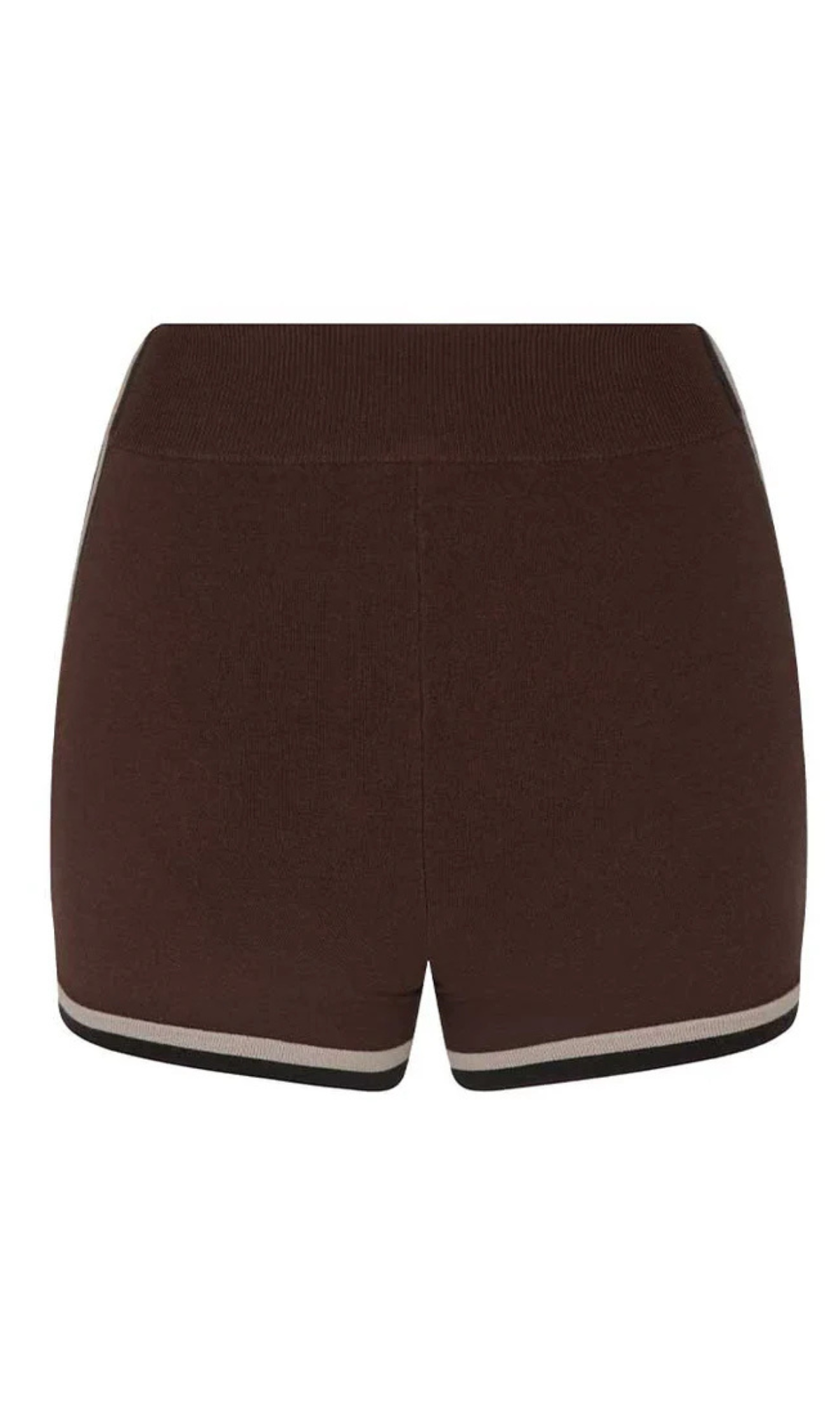 Superfine Merino Wool blend knitted mini shorts with rib waistband. Features colourblock striped panels at side seam and bottom hem. This garment is fully fashioned/engineered to shape, meaning there is minimal yarn wastage during the production process.