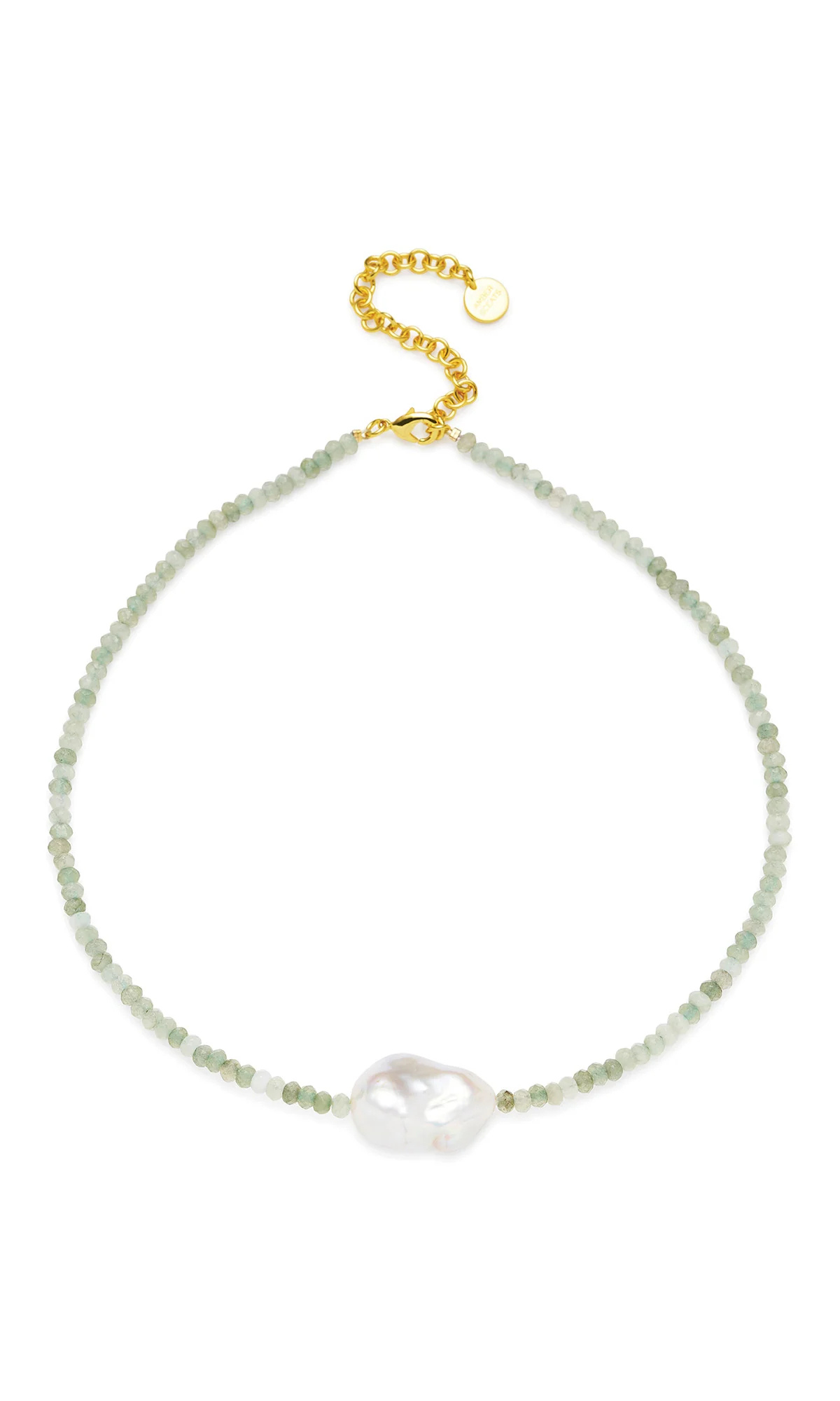 The Toledo Necklace is strung with Green Aventurine crystals and finished with a centred AAA+ freshwater baroque Pearl. Genuine semi-precious materials, please allow for natural variances in stones. Each piece is one of a kind.