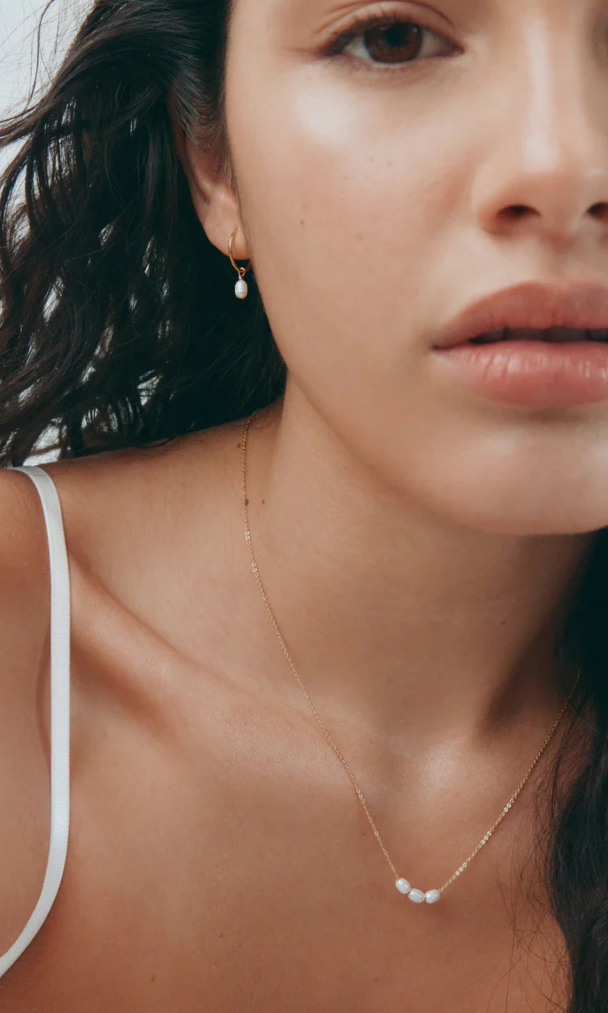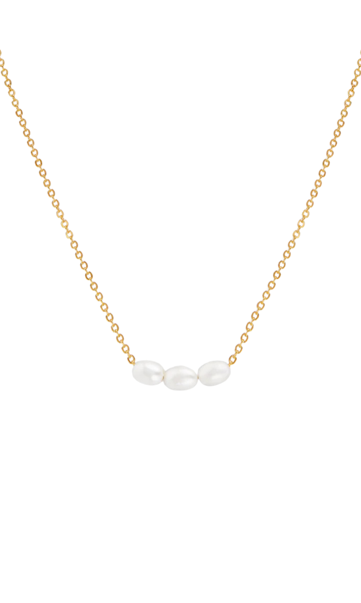 Mini Pearl Necklace will quickly become your go-to everyday style. A modern and elegant update on the classic pearl necklace, featuring three dainty freshwater pearls threaded onto a fine gold chain. Equally beautiful worn alone or layered, this style is the perfect for yourself of someone special.