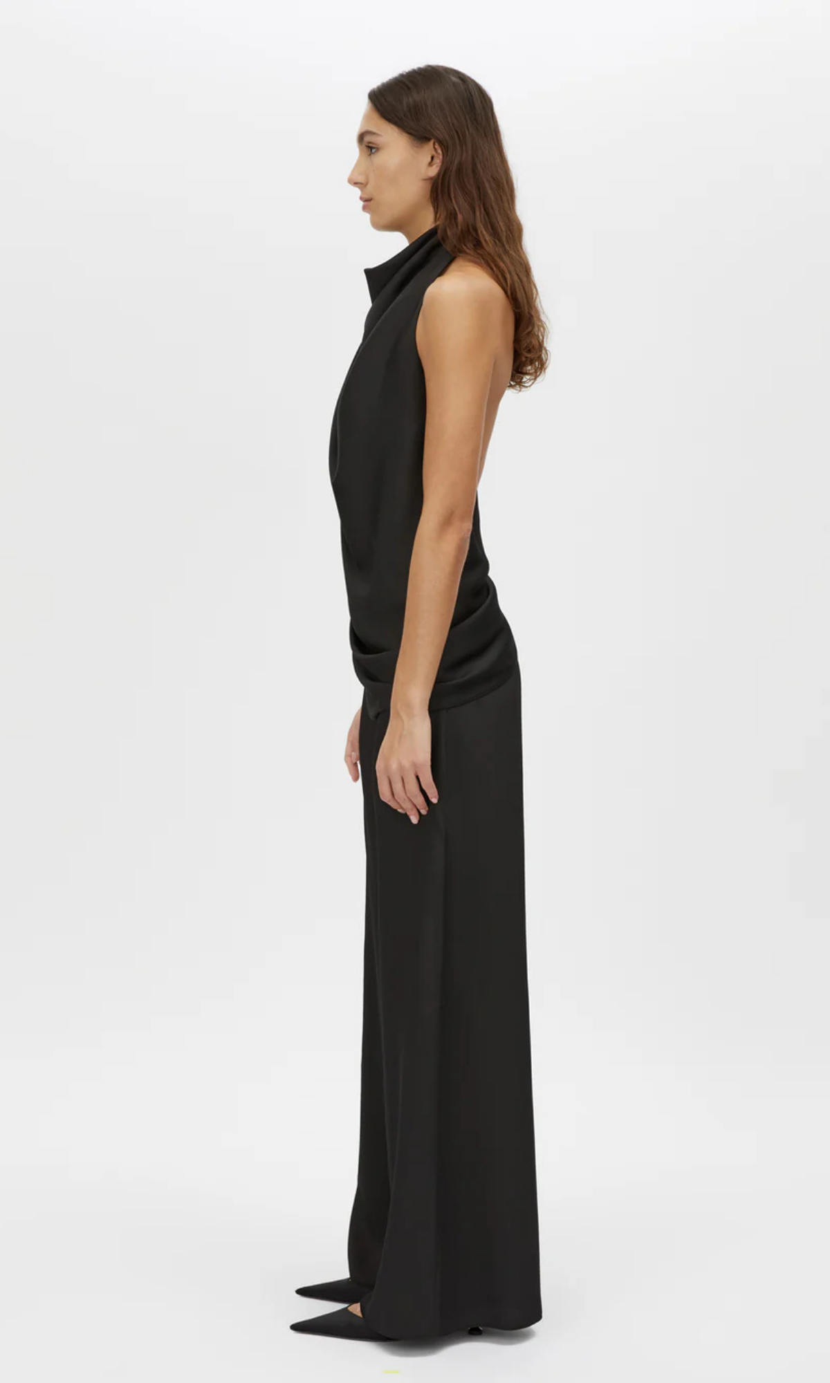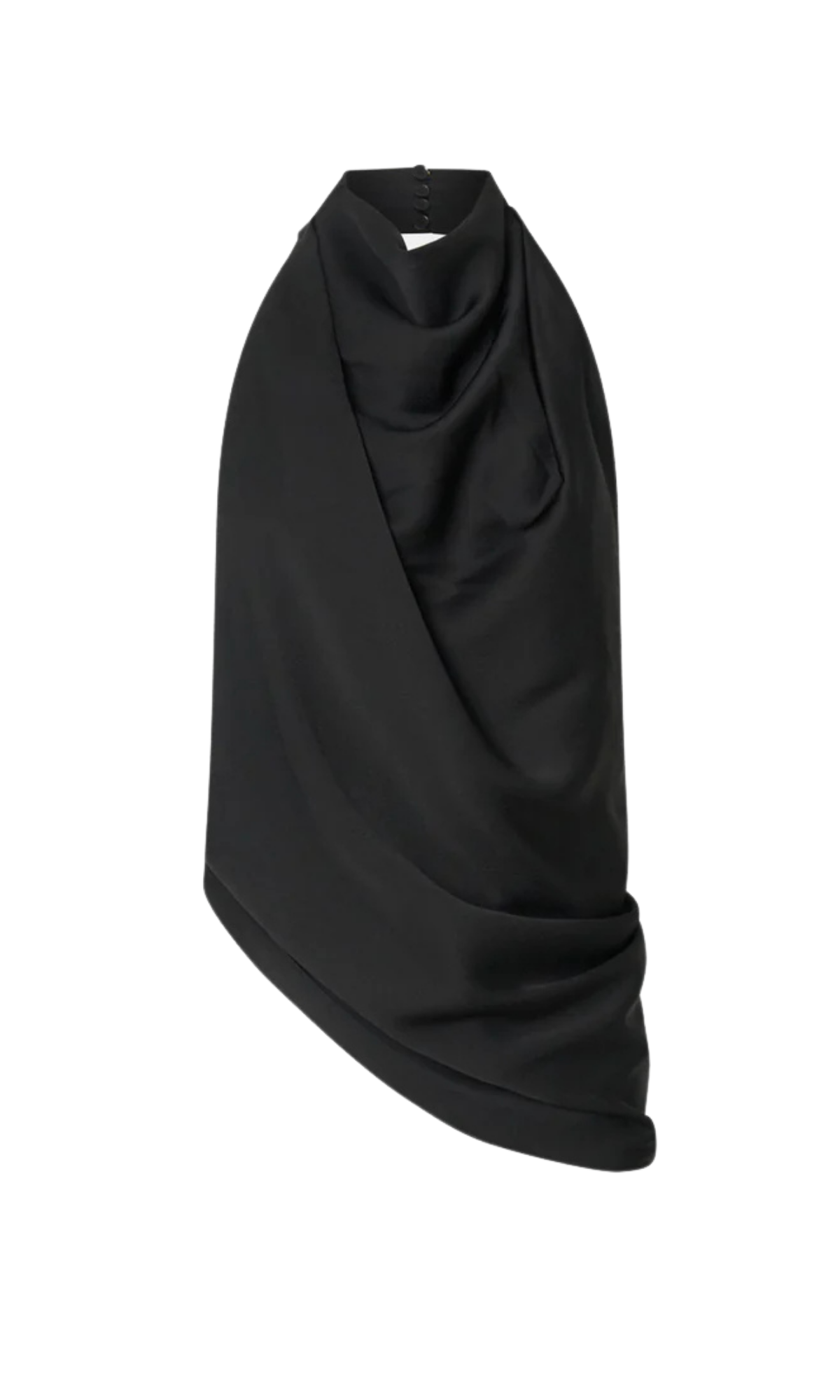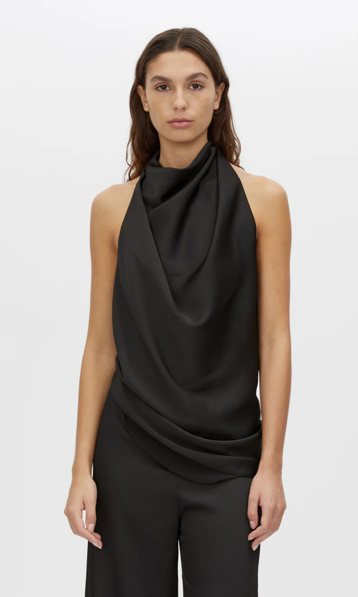 CAMILLA AND MARC Elowyn draped open-back sleeveless halter top in black. Neck button closure with lower back invisible zip. Asymmetric hem, georgette lining.