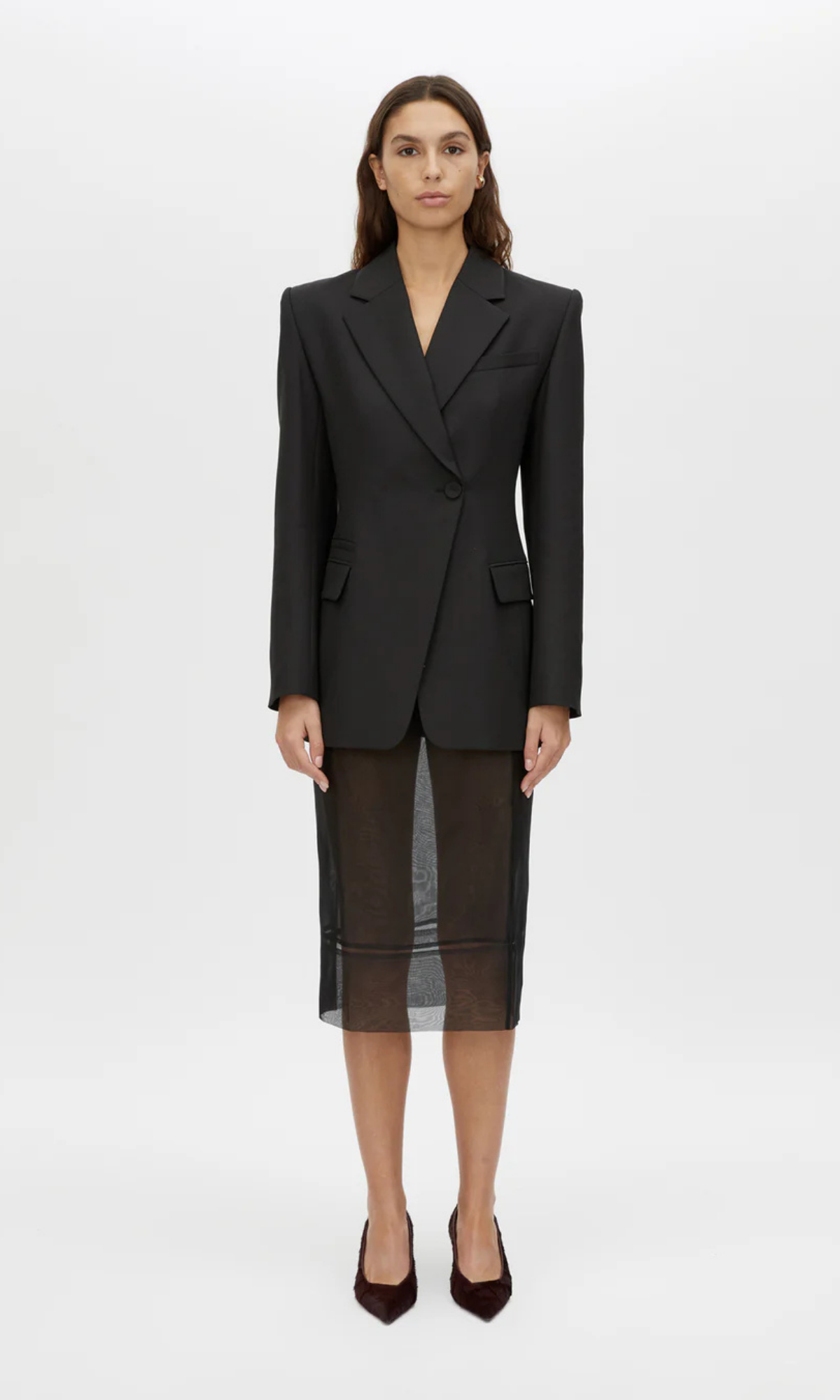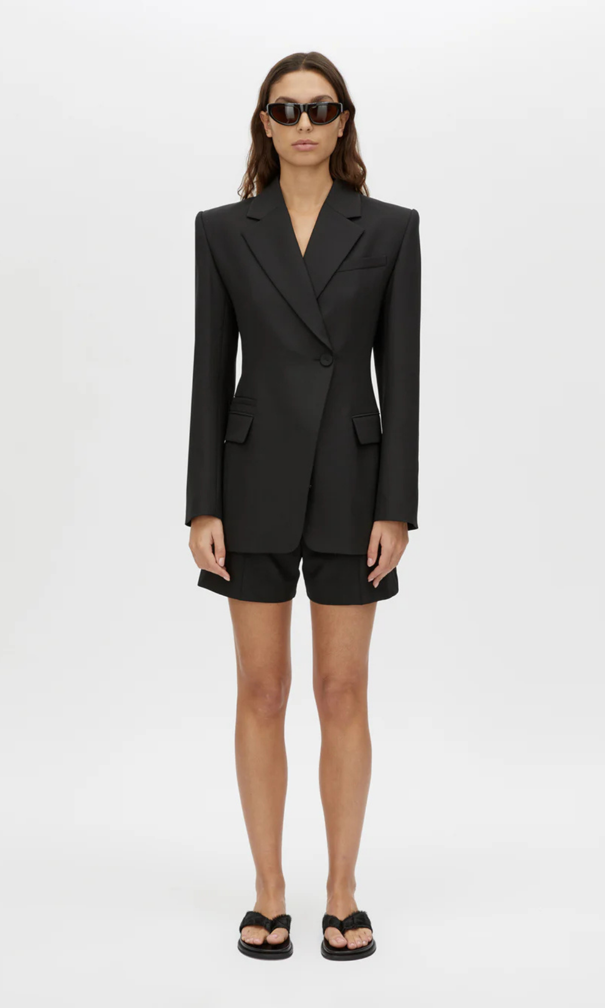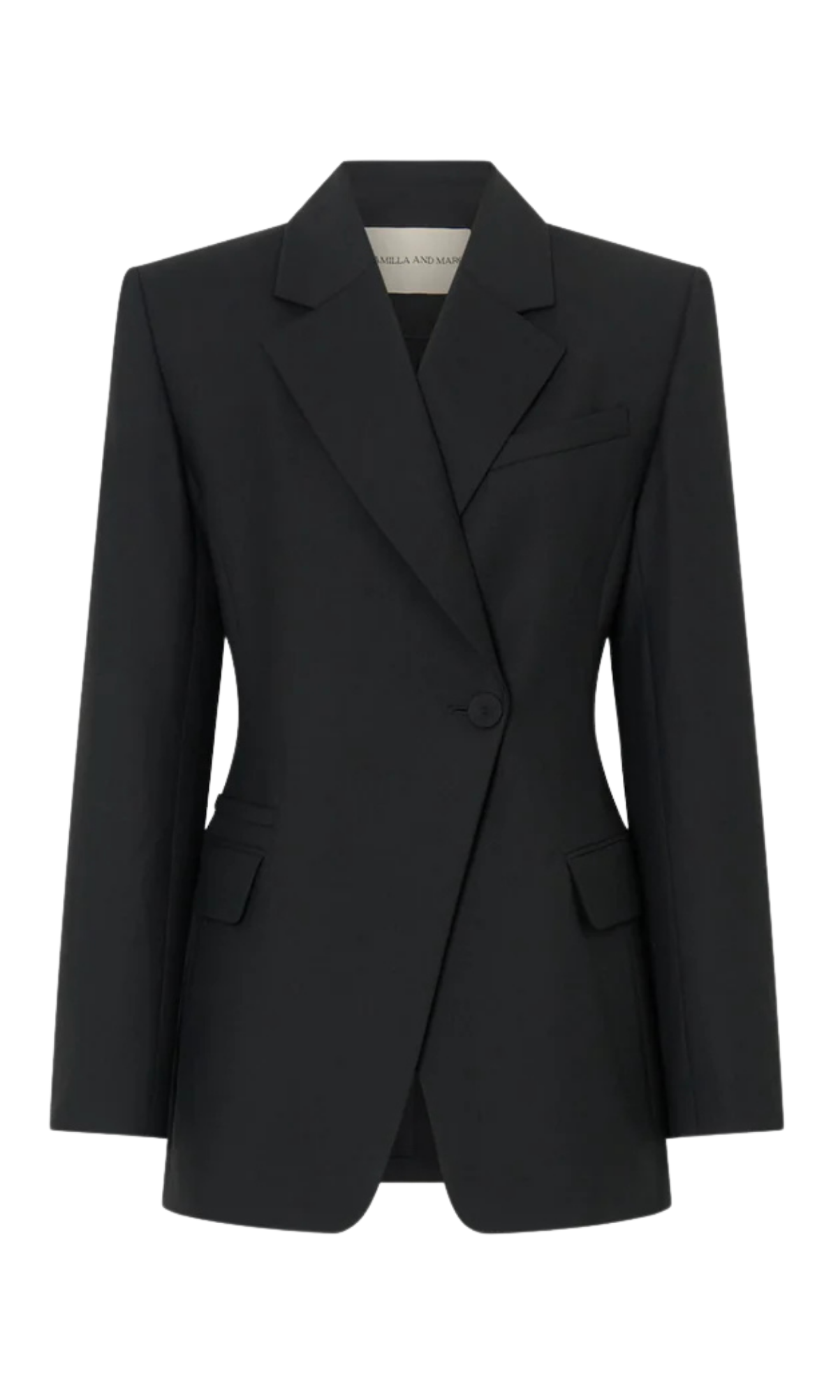 CAMILLA AND MARC Floret single-breasted fitted blazer in black. Shoulder pads, fabric-covered buttons, fully lined.