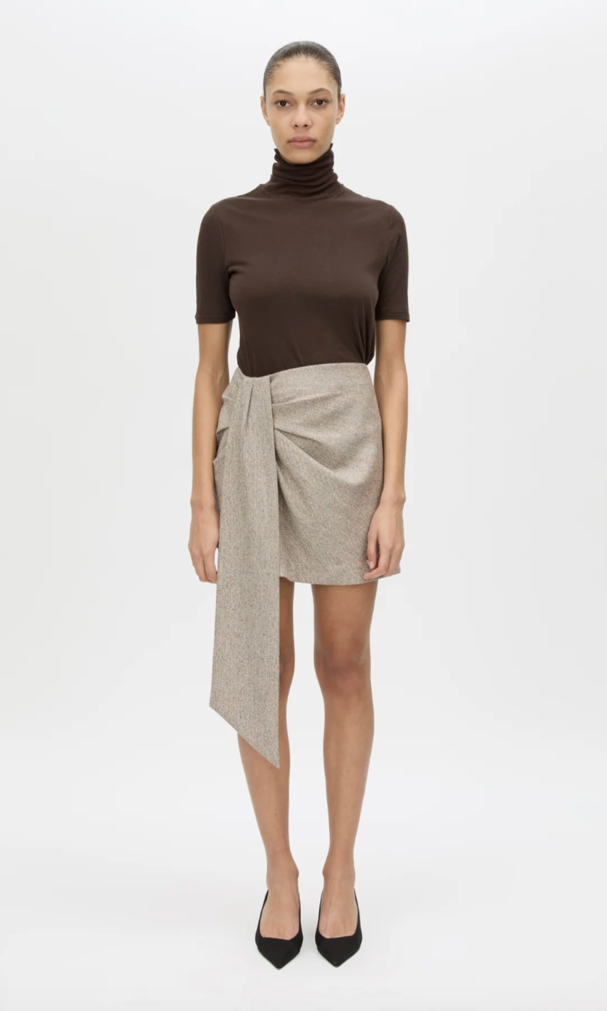 CAMILLA AND MARC Malik draped high-waisted tailored mini skirt in tan herringbone. Front seam tuck, draped tie, blind hem. Centre back invisible zip closure.