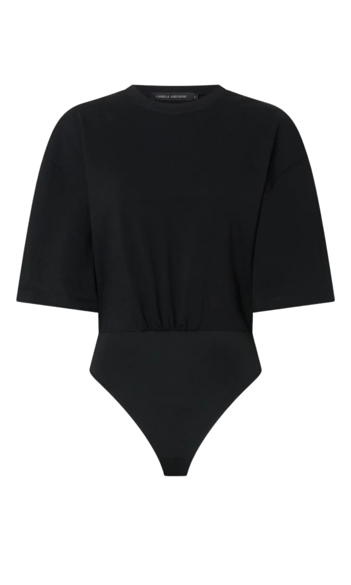 CAMILLA AND MARC Peretti short sleeve t-shirt bodysuit in black. Ribbed neckline, loose rolled sleeves, gathered waist, G-string brief, snap closure.