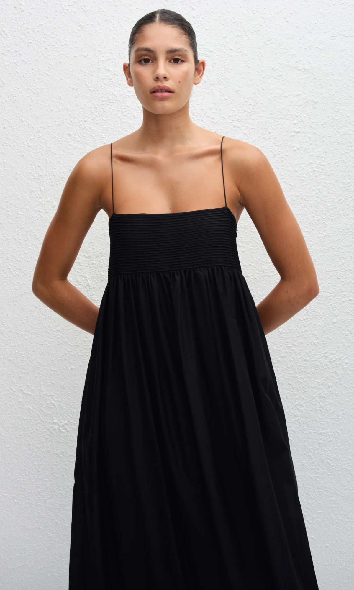 Marianne is 170cm and wears the Empire Pintuck Bodice Dress in Black in a size 2. This style is true to size, take your regular size.
