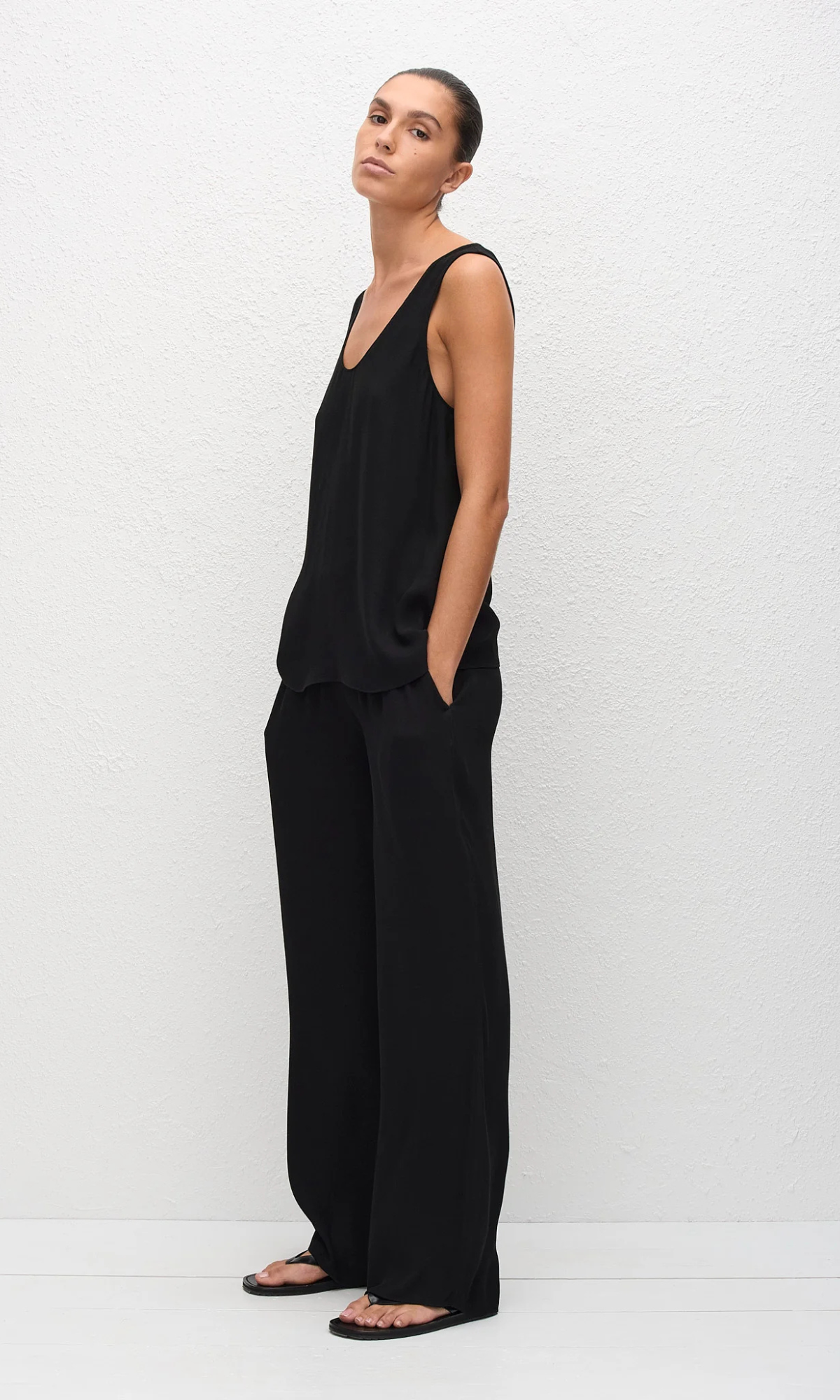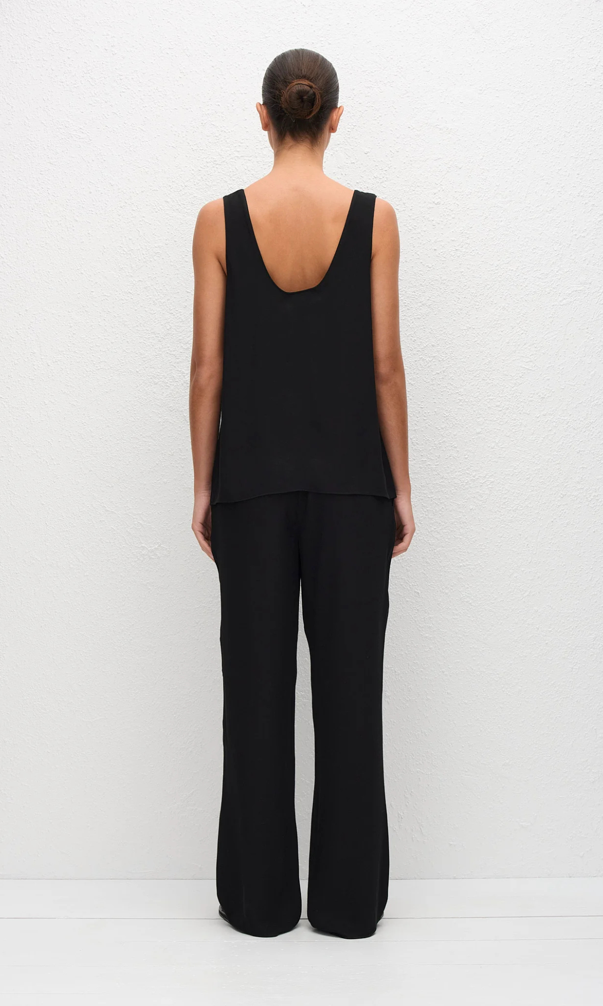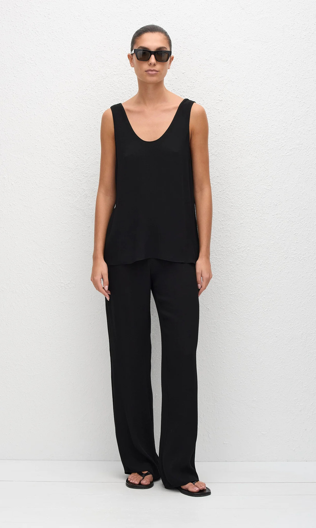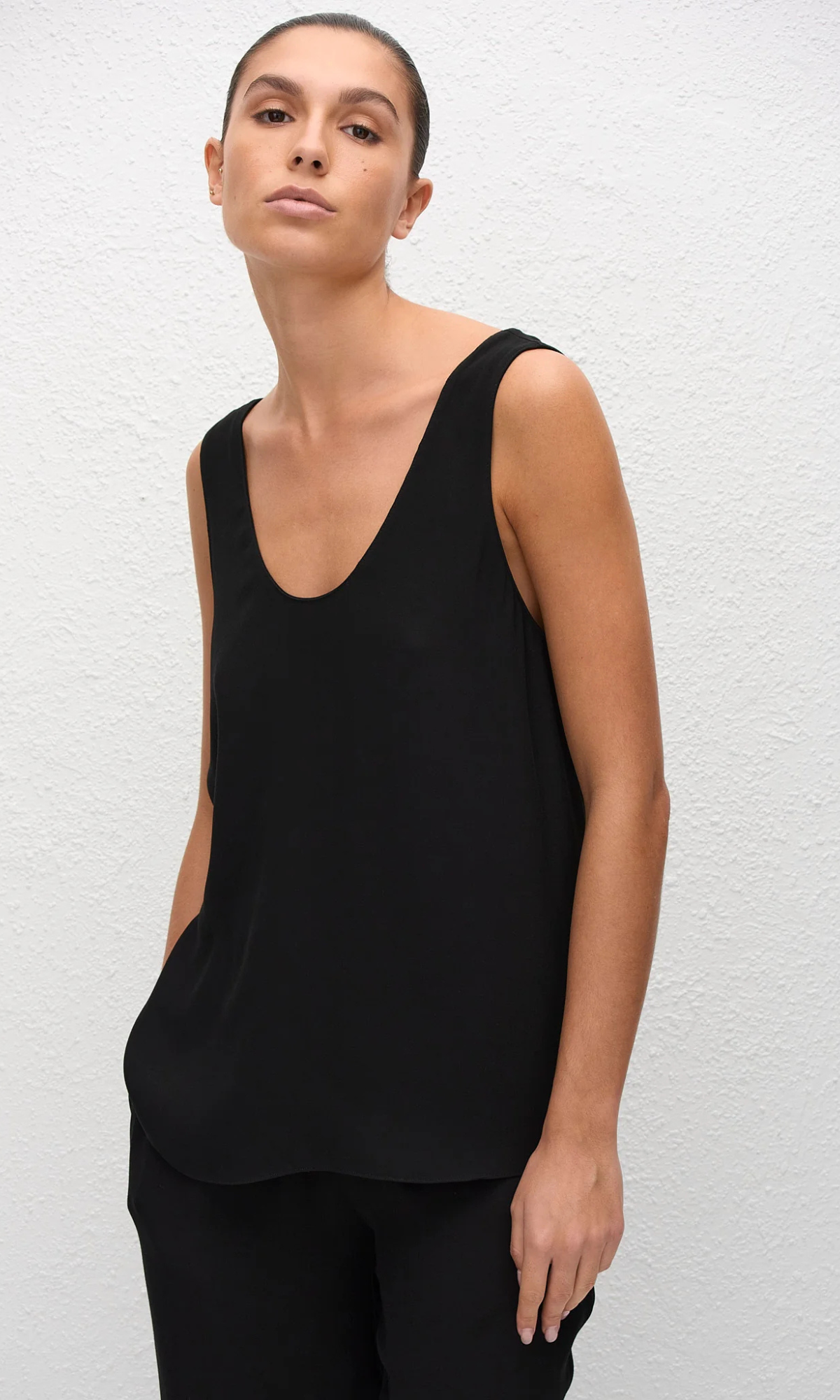 Cristina is 178cm and wears our Fluid Scoop Tank in Black in a size 2. This style is true to size, take your regular size.