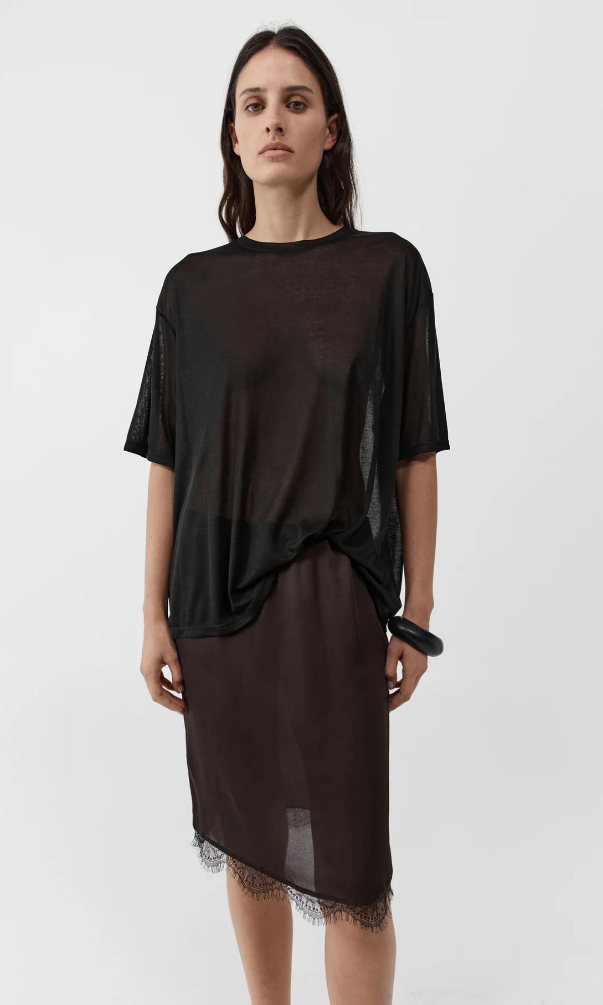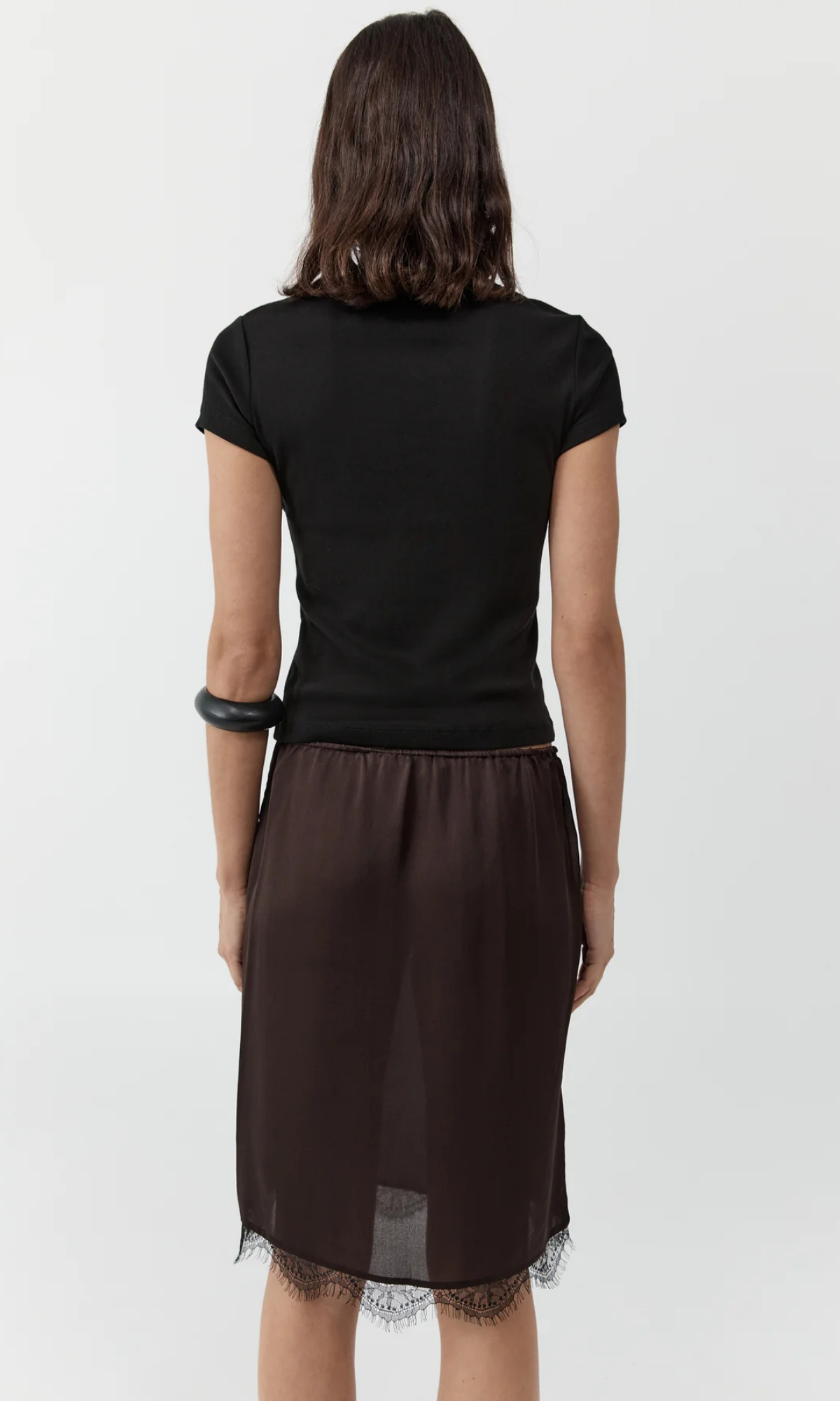 Made from fluid silk, the Fine Lace Skirt sits low on the waist and falls to the knee, finished with a fine lace trim that adds a discreet textural note. Versatile in design, the Fine Lace Skirt transitions with ease from day to evening.