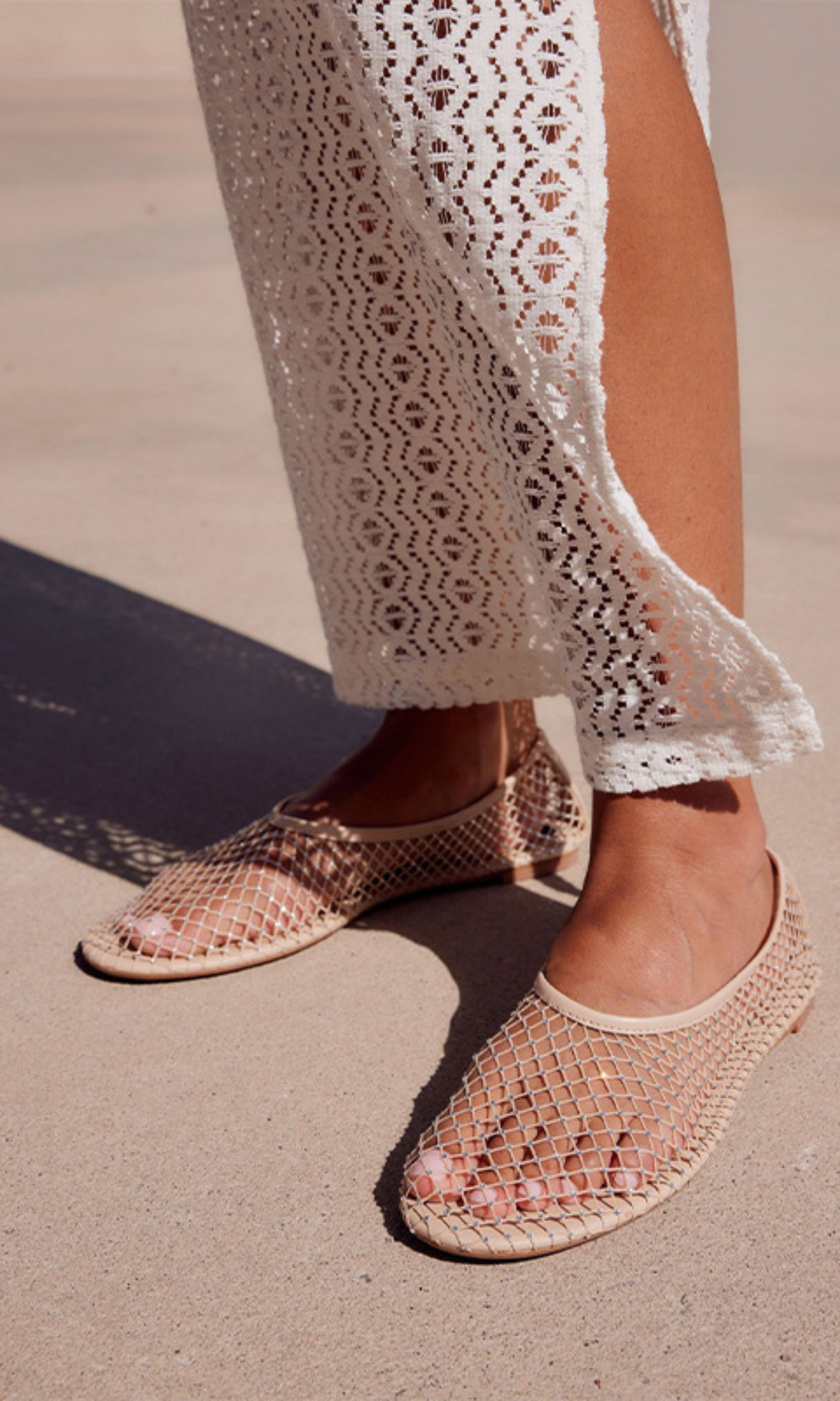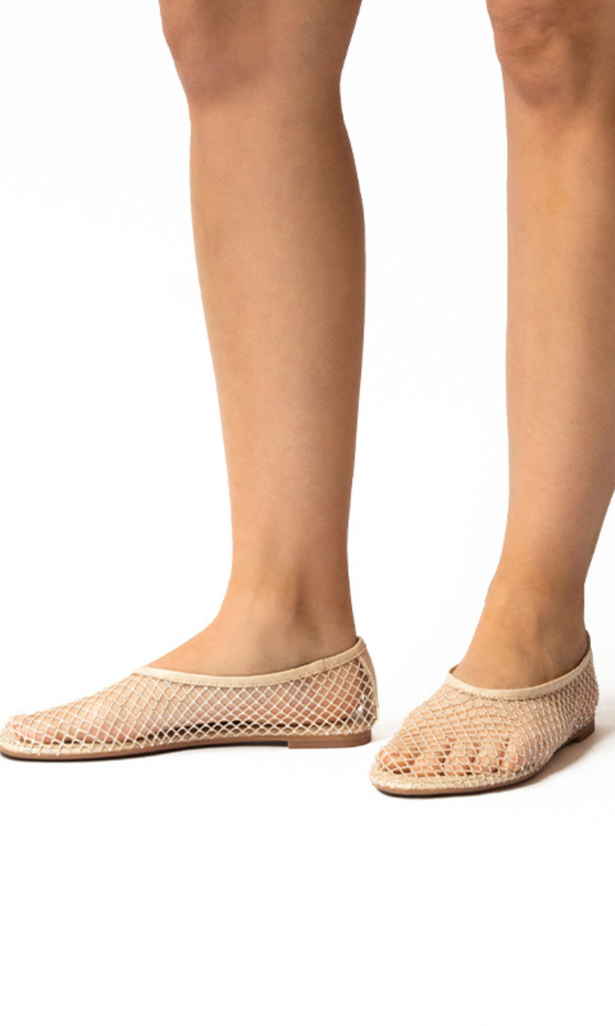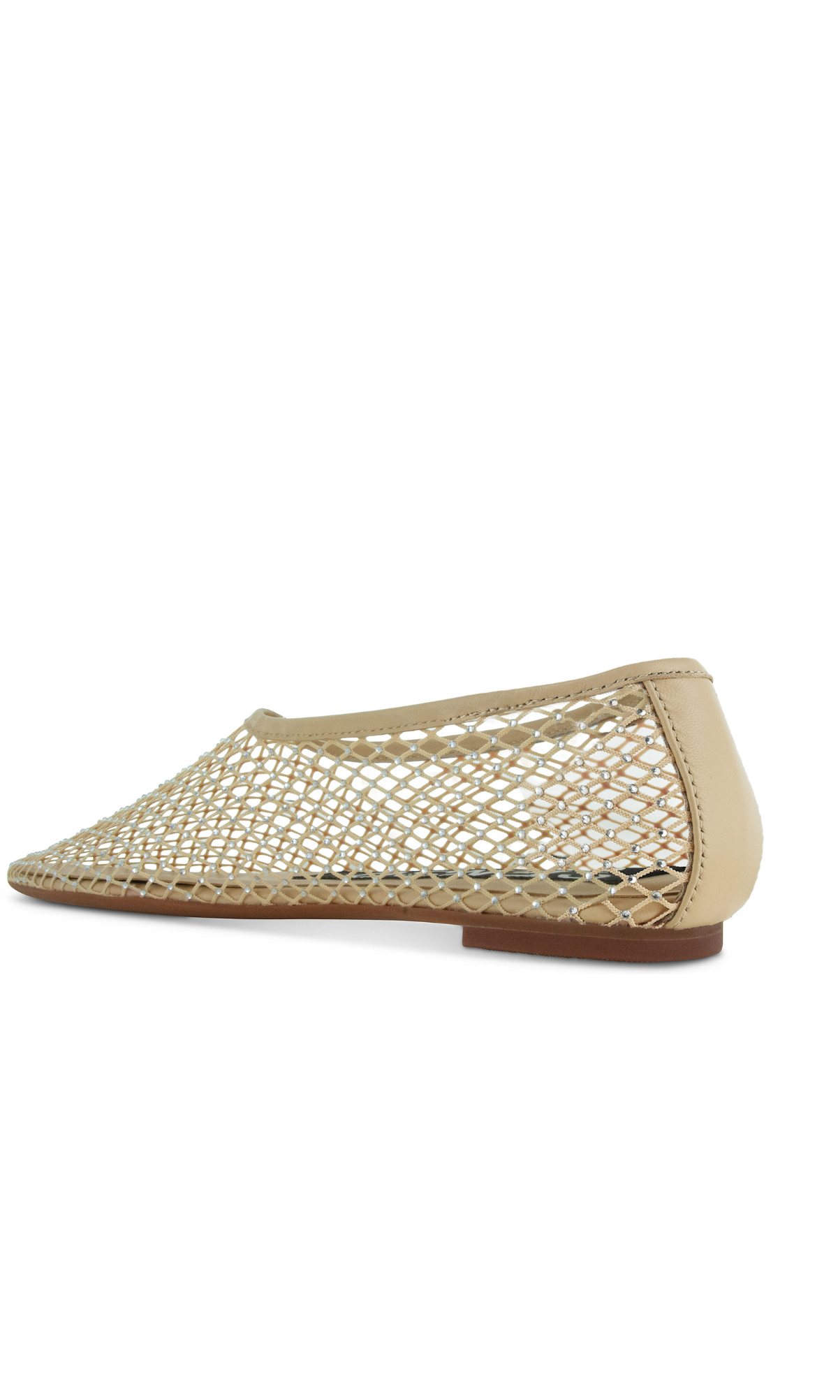 Nude mesh crystal embellished ballet flat featuring a round toe and elasticated throat.