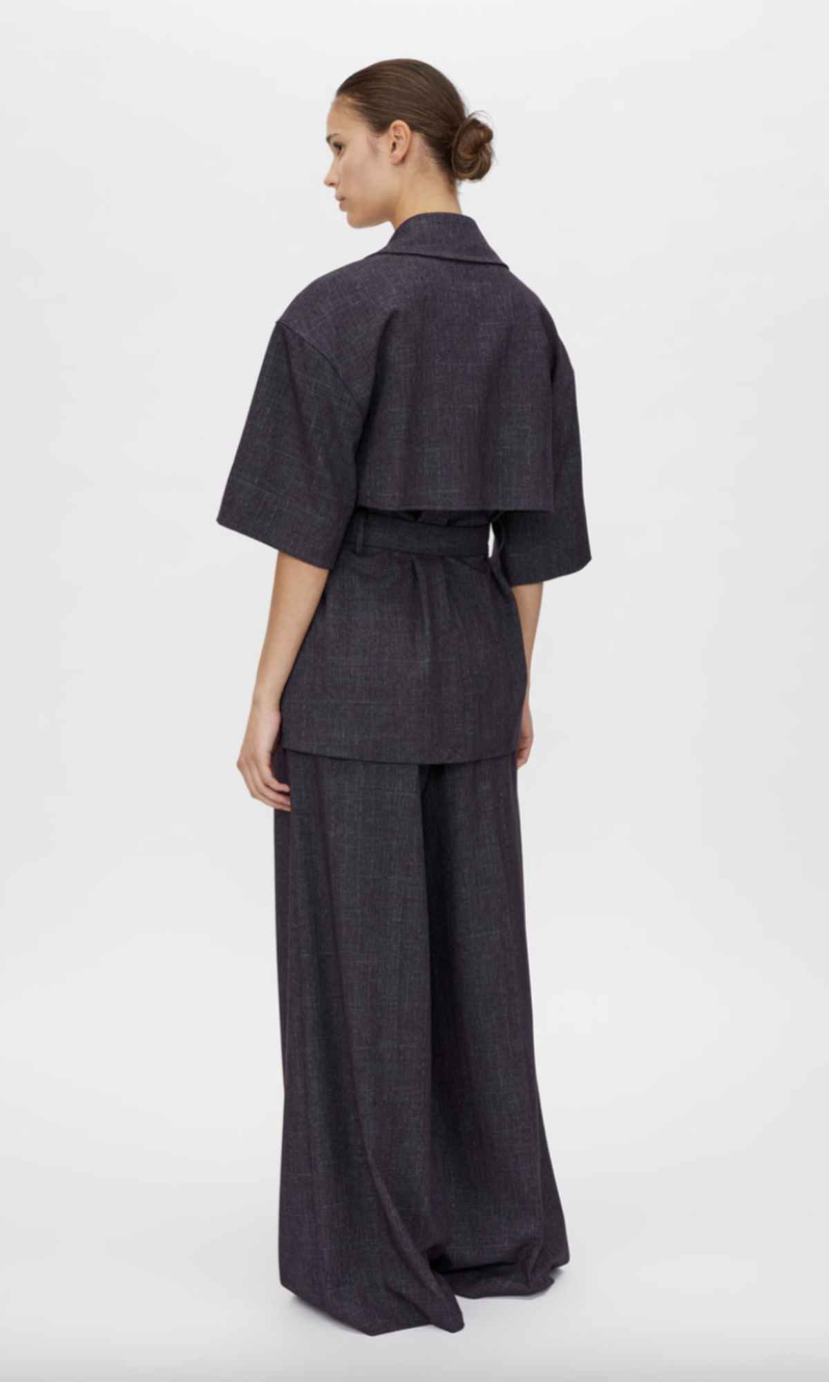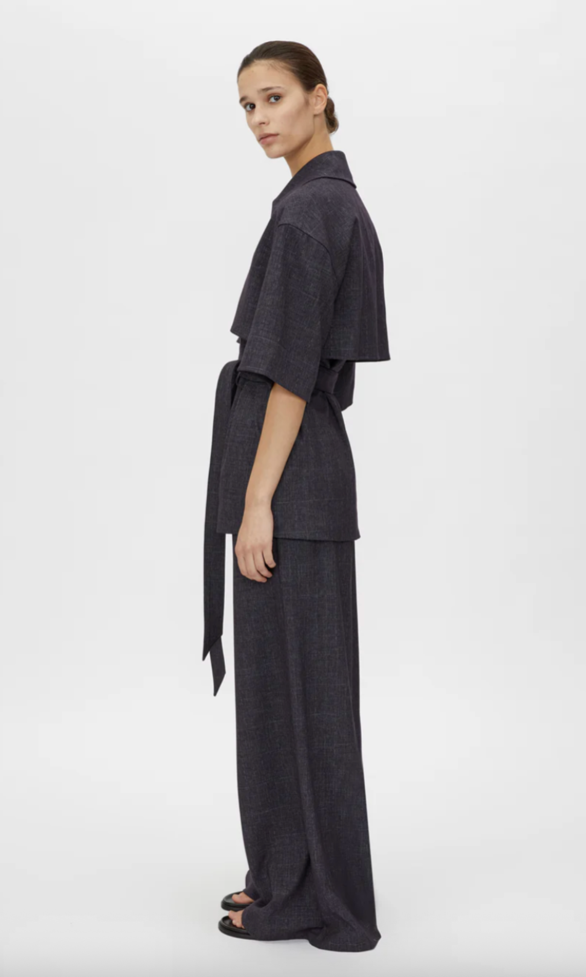 CAMILLA AND MARC Antony short sleeve relaxed navy cropped trench. Front and back storm flap, inseam pockets, back vent, detachable belt. Recycled polyester twill lining.